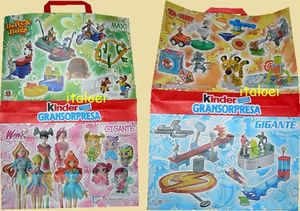 Dieses 6er Pack der Pop Star Grillen ist von den kanarischen Inseln. Garantiert werden 2 Grillen pro Pack. Uns wurde geschrieben, dass sogar Asterix Figuren enthalten sind. Dieses 3er Pack soll es nur in für Reisende am Flughafen im DutyFree Shop geben. Besondere Figuren oder serienbezogene Inhalte sind der Verpackung nicht zu entnehmen. Diese Einkauftüten gab oder gibt es in Italien. Die Aufdrucke zeigen die aktuellen Maxi Gransorpresa Inhalte.