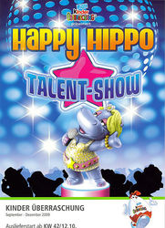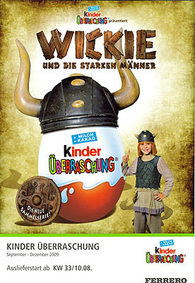 Heute können wir weitere Werbeblätter der neuen Ü-Ei Serie präsentieren. Eine, oder sogar die Hauptfigur von der "Happy Hippo - Talent Show" scheint diese glamouröse Hippo Sängerin zu sein. Die alten Namen wie Susi Sonnenschein oder Babys Baby wurden durch flotte neue Namen abgelöst. Die Serie wird am 12. 10. ausgeliefert und bis im Dezember im Ü-Ei sein. Der Satz besteht aus 9 Figuren, und zwar ein Jurymitglied und 8 Talente. Dieses Werbeblatt zeigt die Hauptfigur Wickie. Ab dem 09. 09. 09 läuft der Kinofilm "WICKIE und die starken Männer" an. Auf der Webseite Wickie. film. de kann der Kinotrailer eingesehen werden. Danke an Hans Dieter Geiger [Hier alle eBay Auktionen]