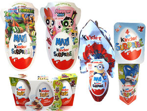 Los geht es mit den Maxi Eiern von den Teenage Mutant Ninja Turtles und The Powerpuff Girls. Daunter ist ein 3er Pack Kinder JOY Eier mit den Crazy Friends zu sehen und dann noch ein Maxi Ei mit den Minions "Moi Moche et Méchant 3".
