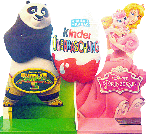 Dies ist der Aufsteller zum Gewinnspiel der Ü-Eier Bettwäsche. Zwischen den beiden Pappaufstellern von Kung Fu Panda und einer Disney Prinzessin ist das Ü-Ei Dekorkissen zu sehen.
