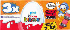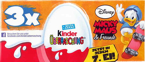 Dieses 3er Pack von Micky Maus und Freunde gibt es im Aldi. Das 3er Pack ist schön bunt in ansprechenden Kinder Farben designt. Durch die den beiden Ausschnitten in der Verpackung können die Ü-Eier gesichtet werden. Die Rückseite ist Tick im sprung mit den sein roten Skatboard zu sehen. Neuerdings gibt es immer einen Hinweis auf die Kinderüberrasschung Seite auf Facebook. Die ersten Sätze haben wir jetzt bei uns im Eierlei Shop. Oder eine Live Suche auf eBay nach Micky und seine Freund starten.