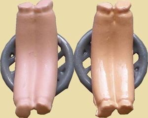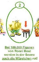 Im Eierlei Forum geht es im wahrsten Sinne um die Wurst. Genau genommen um die Bratwurst von Ronni Rost. Das Bild zeigt einen Ausschnitt aus einem Werbeblatt. Auf dem Ausschnitt ist zu lesen: "Bei 100. 000 Figuren von Ronni Rost werden in der Sonne auch die Würstchen rot"! Zuerst war schon die Überlegung, ob es überhaupt diese rot werdende Wurst gibt. Jetzt sind die ersten Würstchen aufgetaucht. Dieses Bild zeigt die Bratwurst von Ronni. Das linke paar sind die Würstchen, die in der Sonnen rot werden, also die Variante, wo es nur von 100. 000 Stück von gibt. Rechts die Serienwürstchen. Die Variante ist matt und sieht etwas fleischiger aus. Zu der Variante gibt es leider keine speziellen BPZ wie z. B. von der Black Edition. [Mehr dazu in diesen Forum Beitrag]