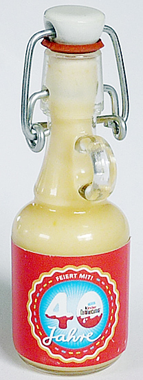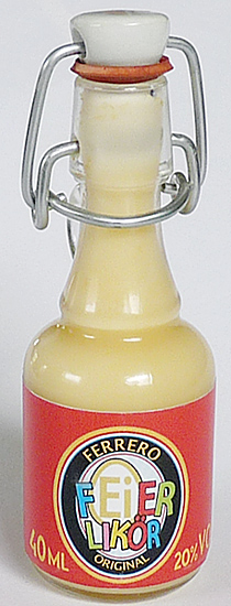 Diese kleine Flasche Eierlikör möchten wir Euch vorstellen. Die Flasche gab es als Geschenk für die Ferrero Vertreter. Auf der Vorderseite ist ein Etikett mit der Aufschrift "Ferrero FEIER LIKÖR ORIGINAL", wobei das EI von FEIER in einem Ei zu sehen ist. Es wird auch kein Zufall sein, dass die Flasche 40ML Inhalt hat entsprechend der 40-jährigen Jubiläums Feier. Die Flasche zeigt wieder die Liebe zum Detail von Ferrero. Auf der Rückseite ist das 40 JAHRE Logo und die Flasche hat eine Lasche, wo z. B. ein Benzel zum Umhängen (ggf. für eine Kohlfahrt) durchgeführt werden kann. Die Flasche soll es vor dem Marylinchen auf Sockel als Geschenk gegeben haben.