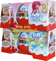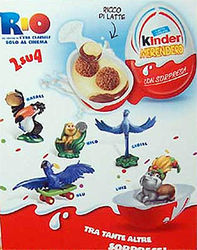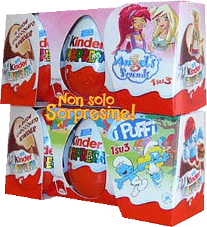 Dies ist die Vorderseite eines 4er Packs der RIO Figuren. Zu bekommen ist das 4er Pack "Kinder MERENDERO" in Italien. Es werden zwei Figuren der Serie pro 4er Pack garantiert. Das Bild rechts zeigt die Rückseite des 4er Packs. Auf der Rückseite sind ein paar Figuren der Serie zu sehen. Auf dem Bild sind zwei 3er Packs zu sehen. Es soll sich dabei um Testverpackungen handeln. Oben ist das 3er Pack von Angels & Friends 2 zu sehen, darunter das 3er Pack von i Puffi. Pro 3er Pack wird eine Figur der jeweiligen Serie garantiert. Alle Sätze aus dieser News können wir im [Eierlei Shop] anbieten.