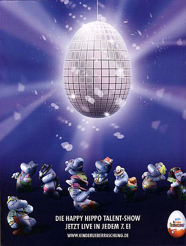 In der aktuellen Zeitschrift "TV Movie" gibt es diese Werbeanzeige. Die Werbung ist auf einer DIN A4 Seite geschaltet. Die übergroße Discokugel ist sogar in Ü-Ei Form. Darunter sind die 9 Figuren zur Serie. In der Popstars Staffel 2009 "Du & Ich" gibt es im unteren Bildbereich eine Werbeeinblendung der Happy Hippos. Die gleiche Werbung erscheint auch in der Show "DAS SUPERTALENT" mit Dieter Bohlen. Damit sind unsere Ü-Ei Hippos schon TV Stars ;-) Die Talent Show im [Ü-Eier Shop]. Danke an Norbert und Spacy.