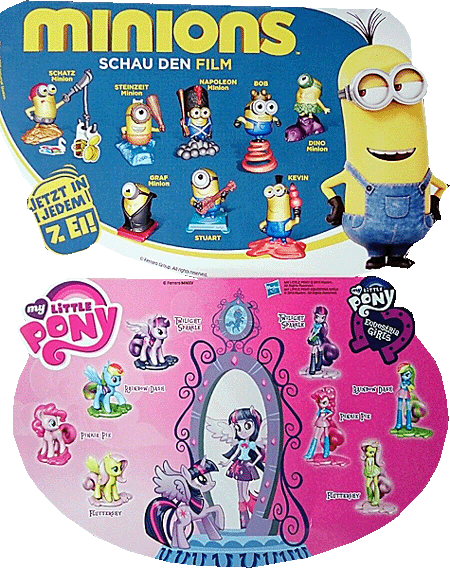 Dies sind die beiden Palettenanhänger von den Minions und My Little Pony. Auf jedem Palettenanhänger sind alle acht Figuren der Serie zu sehen und mit Namen versehen. Nicht auf dem Bild zu sehen ist die weiße Lasche mit 6 Löchern, womit der Palettenanhänger über die Ü-Eier fixiert werden kann. Quelle: [Diese eBay Auktionen]