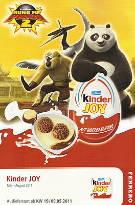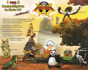 Von dem Cover der Werbemappe der Kung Fu Panda 2 Serie lässt sich entnehmen, dass der Serienstart im Mai ist. Um den Sommer komplett zu überbrücken, läuft die Serie bis August - wenn der Vorrat so lange ausreicht :-) Der Kinofilm zur Serie startet im Juni in 3D. [Deutscher Trailer zum Kinofilm von Kung Fu Panda 2]. Hier ein Bild vom ersten [Kung Fu Panda Satz]. Beim Auseinderklappen der Werbemappe werden alle 8 Figuren der Serie vorgestellt. Es sind viele vertraute Figuren aus dem ersten Teil dabei. Niedlich ist die neue Figur "Baby Po". Die Namen der Figuren von links nach rechts: Master Viper, Master Mantis, Master Tigress, Master Monkey, Po, Baby Po, Master Crane und Lord Shen. Natürlich sind wieder alle Figuren handbemalt. Danke an Hans Dieter für das Bildmaterial