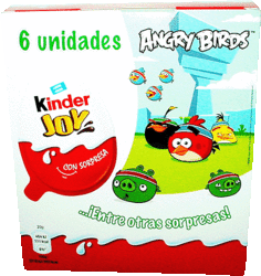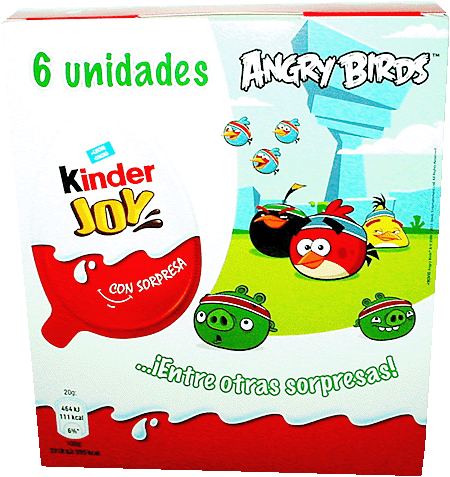 Diesen Palettenanhänger gibt es in Malaysia. Geworben wird mit dem Palettenanhänger "FOR GIRLS". Der Palettenanhänger ist wie das Kinder JOY Ei in rosa designt. An Inhalten sind keine Angry Birds zu sehen. Quelle: [Diese eBay Auktion] In Spanien ist dieses 6er Pack Kinder Joy Eier rausgekommen. Hier ist unschwer zu erkennen, dass Angry Birds Figuren enthalten sind. Quelle: [Diese eBay Auktion]