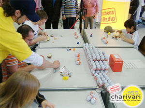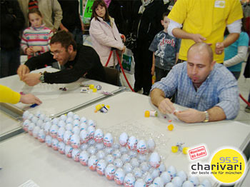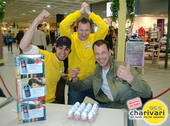 Der Radiosender "Münchens Hit-Radio" hatte am 26. 04. ein Ü-Ei Event gestartet. Heute haben wir Bilder darüber im Netz gefunden. Mitmachen konnten jung und alt, so wie das halt beim Ü-Ei ist ;-) Das Ziel war es: "Wer kann am schnellsten Ü-Eier zusammenbauen und gleichzeitig die leckere Schokolade aufessen?". Zu gewinnen gab es Gutscheine vom Einkaufscenter und Handys, die auf dem rechten Foto zu sehen sind. Nicht nur die Teilnehmer, sondern auch das Team von Münchens Hit-Radio hatte richtig Spaß. Damit sind die 3 Ü-Ei Regeln eingehalten worden "Spiel, Spaß und Spannung" und wir lassen uns überraschen, ob es im nächsten Jahr wieder dieses Ü-Ei Event gibt. 244 Bilder können unter [www. charivari. de] angeschaut werden.