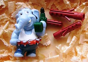 Von der kommenden August Serie "Die Heimwerker Elefanten" wird es ein 4er Pack geben. Es sollen 2 Figuren pro 4er Pack garantiert werden. Das Bild zeigt die beiden Aufsteller vom 4er Pack. Oben in der Leiste sind alle Figuren der Serie zu sehen, aber leider nicht deutlich. Hier ein größeres Bild von DAN DÜBEL. Mit dem Akkuschrauber bewaffnet steht er lässig da. Im Gürtel sind die Schrauben. Der Untertitel der Serie lautet "Dickhäuter & Dünnbrettbohrer". [Live Such auf eBay nach den ersten Heimwerker Auktionen]