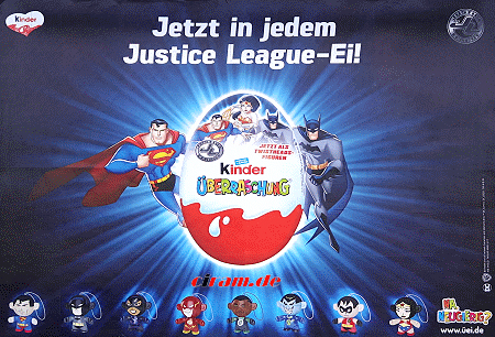 Ist der Mitte steht das Ü-Ei umgeben von Superman und Batman.