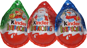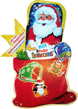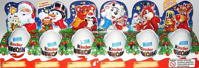 Dieses Jahr gibt es diese 3 unterschiedlichen Weihnachtsmotive von den Ü-Eiern. Die aufwendige Verpackung ist dafür gedacht, am Weihnachtsbaum plaziert zu werden, deswegen oben die Öse. In den Eiern sind unter anderem die Weihnachtsboten enthalten. Im 4er Pack der Weihnachtsboten wird eine Figur garantiert. Es gibt zwei unterschiedliche weihnachtliche 4er Packs. Das Bild zeigt den Palettenanhänger vom 4er Pack. Im Adventskalender 2011 ist der ganze Satz der Weihnachtsboten enthalten. Der Mini Maxi Satz der Weihnachtsboten besteht aus 5 Teilen. Das letzte Bild dieser News zeigt das 6er Pack der Weihnachtsboten. Die einzelnen Eier können von der Umverpackung abgetrennt werden. Jede Packung hat eine Öse und unten auf der Vorderseite kann ein Name eingetragen werden, wer dieses Geschenk bekommen soll. Zwei Figuren der Serie werden garantiert. [Die ersten eBay Auktionen der Weihnachtsboten]