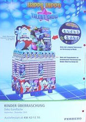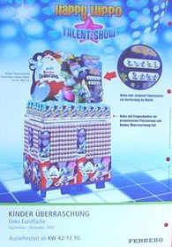 Viele Happy Hippo Fans warten schon lange auf eine neue Ü-Ei Serie der Hippos. Nun ist es soweit, am 12. 10. 09 sollen die Happy Hippos kommen. Das Werbeblatt zeigt 9 Hippos, die an einer Talentshow teilnehmen. Die Figuren sehen flippig und cool aus. Die Namen der Figuren kann man auf dem Werbeblatt leider nicht lesen. Dieses Werbeblatt zeigt 4 Ü-Ei Aufsteller. In dem Pappschild über dem Aufsteller ist ein Figurensatz integriert. Den Satz wird es sicherlich wieder in der jeweiligen Supermarkt Filiale zu gewinnen geben. Quelle der Werbeblätter sind diese eBay Auktionen: Artikelnummer: 380126836084 Artikelnummer: 380126836235