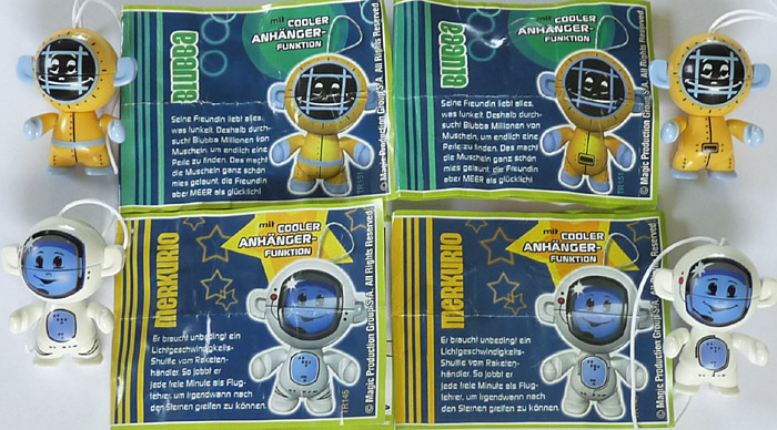 Die Crazy Connection Serie steckt voller Varianten. Wir haben bis jetzt 7 Varianten in dem Satz gezählt. Gerade am Anfang ist schwer zu sagen, welche Figur nun seltener ist und damit die Variante. Außergewöhnlich ist, dass sogar der Beipackzettel die Variation zeigt. Auf dem Bild ist oben Blubba zu sehen mit und ohne Gürtelschnalle. Genau so, wie auf dem dazugehörigen Beipackzettel. Bei Merkurio hat die Figur links Streifen an den Beinen, die rechts bei der Figur nicht zu sehen sind. Auch der "Rahmen" auf dem Bauch ist unterschiedlich. Das waren 2 Varianten der Serie. Dann kommen noch Big Love, Shateki, Capitano Cattura, Mac Zap und Fränki. Alle 7 Varianten haben wir schon im Variantenarchiv auf Eierlei.