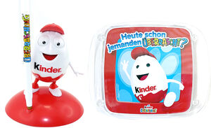 Die Kinderino Figur als Stiftehalter ist ca. 10 cm groß. Dazu gehört ein Kugelschreiber mit der Aufschrift „Überraschung“.