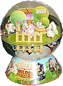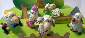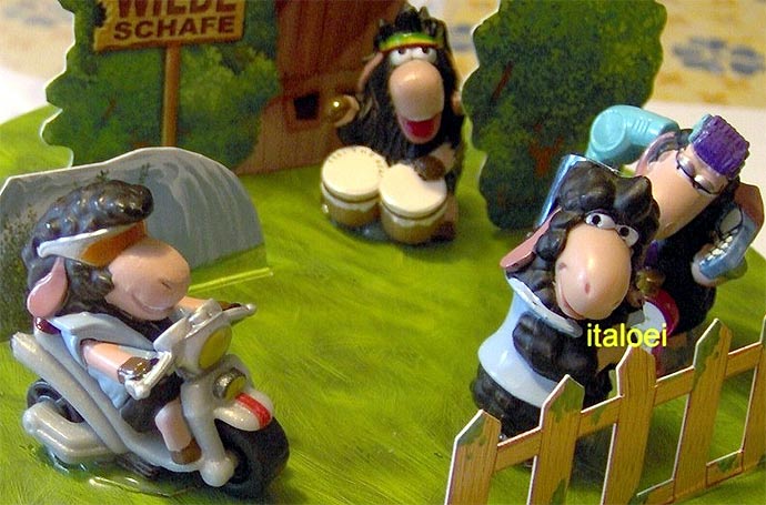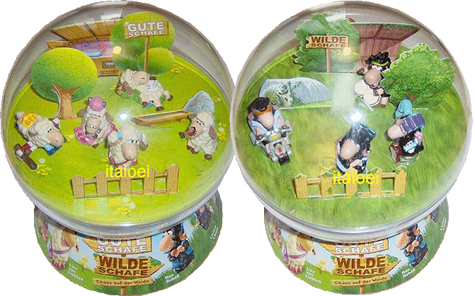 Die 5 weißen Schafe tollen entspannt auf der hellen Wiese, bei den 4 wilden schwarzen Schafe hingegen herrscht wilder Trubel auf einer dunkleren Wiese - Motorrad fahren, trommeln, sowie mit dem Handy telefonieren und gleichzeitig die schwarzen Locken föhnen. Dieses kleine Bild des Dioramas zeigt, dass die Kugel gedreht werden kann. So kann jeder die guten oder wilden Schafe nach oben drehen. Diese beiden Detailbilder zeigen alle 9 Schafe. Die Namen der weißen Schafe sind: Sven Startklar, Nils Nickerchen, Timmi Träumer, Oma Wolle und Lisa von Lieblich. Die schwarzen Schafe sind P. C. Peace, Larissa Läster, Kurt Knatter und Ron Rebell. [Live Suche auf eBay nach den Diorama starten]
