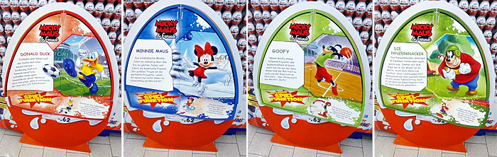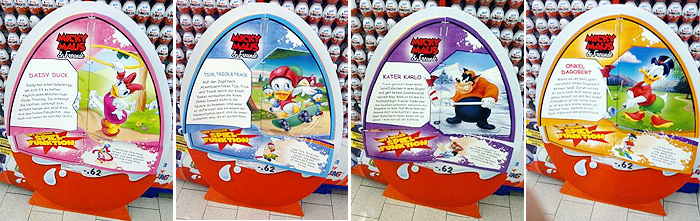 Bei dem Aufsteller handelt es sich um einen Klapaufsteller, der wie ein Buch durchgeblättert werden kann. Enthalten sind alle 9 unterschiedlichen Figuren aus der Micky Maus Serie. Zu jeder Figur gibt es den Beschreibungstext zur Figur wie auf den Beipackzetteln. Dann wird noch auf die "SPIEL FUNKTION" der jeweiligen Figur hingewiesen.
