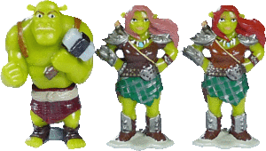 Kurz nach dem Serienstart ist es immer schwer zu bestimmen, welche Figuren sind die Varianten. Klar ist, dass es gezielt Varianten bei den Shrek 4 Figuren gibt. Links geht es los mit Bogan. Dieser Bogan hat den Lendenschurz braun bemalt. Die häufigere Figur von Bogan ist mit grauen Lendenschurz ausgestattet. Von Fiona gibt es drei unterschiedlich bemalte Figuren. In der Mitte ist Fiona mit hellroten Haaren und dunkelbraunem Oberteil. Der Kettenanhänger ist hellblau. Die Fiona rechts daneben hat rote Haare und ebenfalls einen hellblauen Kettenanhänger. Die nicht abgebildete Fiona ist unserer Meinung die momentan häufigste Figur, sie hat rote Haare und einen grünen Kettenanhänger. Neu im Shop ist die Shrek 4 Rubrik, wo wir noch alle Serienfiguren, Sätze und Varianten von Shrek 4 anbieten können. [Direkt zur neuen Shrek 4 Rubrik]. Im Shop ist auch die Serienfigur von Bogan und Fiona zu sehen.