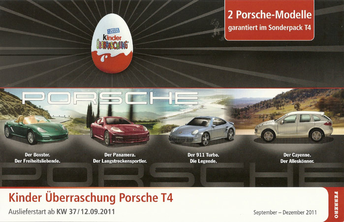 Das Werbeblatt zeigt uns die vier Porsche Modelle. Es ist der Boxer, Panamera, 911 Turbo und der Cayenne. Im 4er Pack werden zwei dieser Fahrzeuge garantiert. Auslieferungsstart ist der 12. 09. 2011.