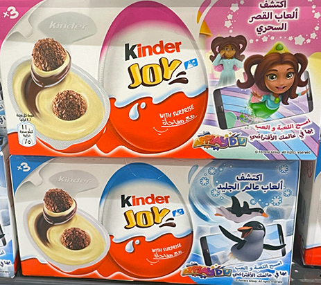 Dies sind zwei arabische dreier Packungen in rosa und blau. Enthalten sind wegen der Wärme Kinder Joy Eier. Der genaue Inhalt kann anhand der Verpackung nicht bestimmt werden.