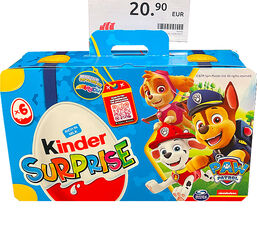 Auf dem ersten Foto ist ein Koffer von Paw Patrol zu sehen. Der Koffer beinhaltet 6 Kinder SURPRISE Eier. Preis 20,90 Euro für sechs Ü-Eier.