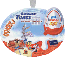 In Polen wird durch das Poster und den PAH ordentlich für die Looney Tunes geworben. Das Poster hat die Abmessungen von 47x 67 cm. Der PAH hat oben eine kleine Lasche, um Halt zwischen den Merendero Eiern zu finden. Quelle: acn. waw. pl/kindersl/index. htm Auf dem Bild zu sehen ist ein Kinderrucksack als Sonderverpackung aus Italien. Inhalt sind 6 lose Merendero Eier, wobei 2 bis 3 Looney Tunes Figuren oder Spielzeug enthalten ist, in den anderen sind K04-Spielzeuge. Der original Preis ist 5,90 Euro und der Rucksack scheint recht selten zu sein. Die Abmessungen sind: Höhe 20 cm, Breite 16 cm und Dicke 6 cm. An jedem Rucksack ist so ein Pappanhänger, der mit einer dünnen Perlonschnur befestigt ist. [Zur der eBay Auktion der Sonderverpackung] [Looney Tunes Figuren im Eierlei Shop]