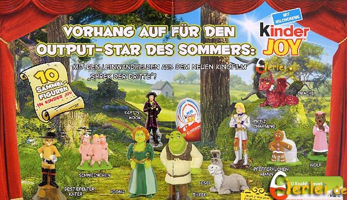 Dieser Bildausschnitt aus der Ferrero Werbemappe 2007 zeigt die 10 kommenden Shrek III Figuren. Geplanter Serienstart ist der 07. 05. 2007. Da die Schrift nicht so gut zu lesen ist, hier noch mal die Namen der Leinwandhelden: Gestiefelter Kater, Schweinchen, Fiona, Käpt\'n Hook, Shrek, Esel, Prinz Charming, Pfefferkuchenmann, Drache und der Wolf!