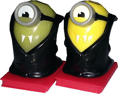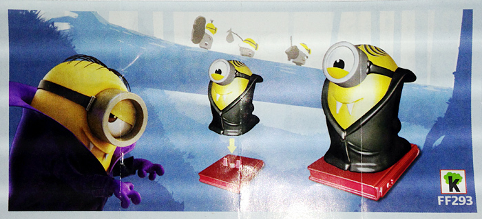 In den deutschen Ü-Eiern steckt bis jetzt immer der grünliche Graf Minion, obwohl auf den Beipackzetteln ein gelber abgebildet ist. Vielleicht, weil der grüne Graf Minion Nachts erwacht und dann gelb leuchtet. Der gelbe Graf Minon hat keine im Dunkeln leuchtende/fluoreszierende Eigenschaft. Auf der gestrigen Bochum Börse haben wir erfahren, dass der gelbe Graf Minion bis jetzt nur in Südamerika in den Ü-Eiern war. Der Beipackzettel kommt aus Südamerika. Hier ist die Ferrero Nummer FF293, bei uns ist es die FF293A. Eigentlich ist die Nummer immer gleich und nicht mit einem "A" am Ende erweitert. Danke an Ulrike D. für die Information.