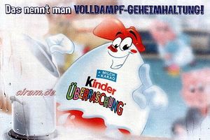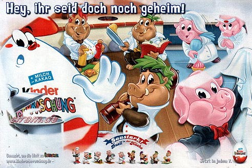 Zur Zeit ist die Werbung von dem Duell in der Küche überall gegenwärtig. Diese beiden Werbeanzeigen sind in diversen Zeitschriften zu sehen. Es handelt sich um eine zweiteilige Werbung. Auf dieser Seite ist noch alles voller Dampf und damit unscharf. Der Slogan dazu lautet: "Das nennt man VOLLDAMPF- GEHEIMHALTUNG!" Auf der zweiten Seite hat Toni Tataaa die Scheibe vom Küchendampf befreit. Nun sieht man neben dem Eiermann drei Schweine vom Team Saustark und drei Schweine vom Team Pick fein. Darunter ist noch der ganze Satz zu sehen.