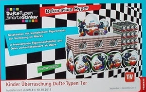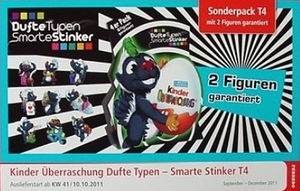 Diese Ferrero Werbeblätter zeigen die Oktoberserie. Der Satz besteht aus 9 niedlichen Stinkern. Am 10. 10. 11 wird es ein 4er Pack geben. Pro 4er Pack sind zwei Figuren garantiert. Auf diesem Werbeblatt sind die großen Ü-Ei Aufsteller zu sehen und daneben müsste ein Aufsteller mit den 4er Pack stehen. Quelle: [Diese eBay Auktion]