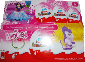 In der Ukraine gibt es schon die beliebte Kinderino Sport Serie. Laut Werbeblatt wird es die Kinderino Sport Serie zu Ostern in Italien geben. Die Figuren stecken sogar in Harry dem blauen Osterhasen. [Live Suche auf eBay nach den Figuren starten]. Dieses 3er Pack für Mädchen gibt es in Österreich. In den Ü-Eiern des 3er Packs sind gezielt Mädchen Spielsachen enthalten.