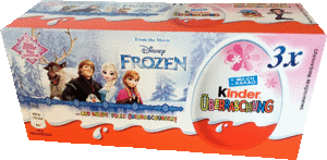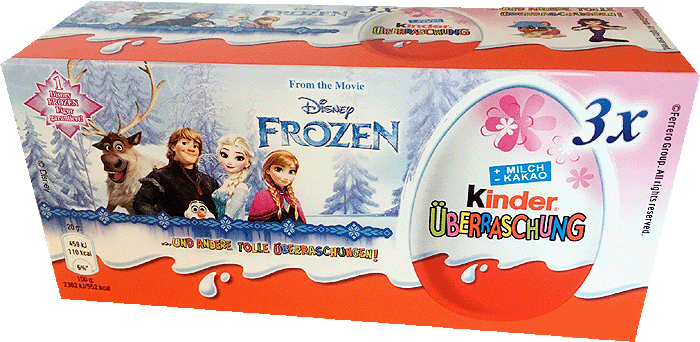 In der Schweiz ist dieses dreier Pack Ü-Eier rausgekommen. Deutlich wird mit den Figuren aus dem Film geworben. Pro Packung ist eine Frozen Serienfigur garantiert.