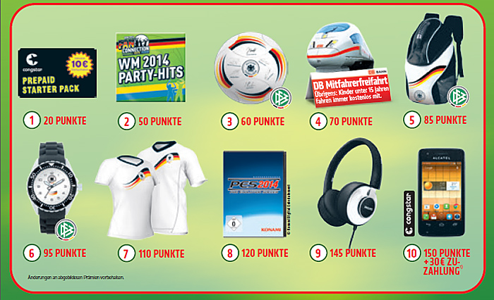 Bevor es zu spät ist, möchten wir noch darauf hinweisen, dass die Sammelpunkte Aktion von Ferrero sich dem Ende nähert. Das Sammelheft muss bis zum 14. 07. 2014 eingesendet werden. Das Bild zeigt die Fan Connection Prämien und deren benötigen Punktezahl. Wem noch sehr viele Sammelpunkte fehlen, kann diese unter anderem in Auktionen ersteigern, wo andere Sammler ihre Punkte anbieten. Zur Zeit sind über 350 Auktionen mit Sammelpunkten online: [Live Suche auf eBay nach den Sammelpunkten von Ferrero Fan Connection WM 2014]. Zum einfordern der Prämien wird das Sammelheft benötigt. Wer kein Sammelheft bekommen hat, kann es auf dieser Ferrero Seite als *. pdf herunter laden fanconnection. de