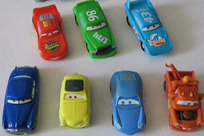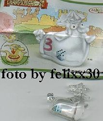 In Europa sollen zehn Glasgeister im Überraschungsei erscheinen. Das Bild zeigt einen Beickpackzettel und unter diesem eine Figur aus der Serie. In jeder Figur befindet sich ein kleiner sechsseitiger Würfel. Der Namen dieser Nebenserie lautet "CHAMPIONGHOST"! Das Bild zeigt alle sieben Disney Cars die in Mexiko erscheinen werden. Quelle: [Diese Auktionen]