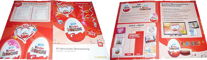 1974 startete Ferrero mit dem Ü-Ei. Im nächsten Jahr wird das 40 jährige Jubiläum gefeiert mit der "Best of Serie". Jetzt gibt es die erste Werbemappe von Ferreo dazu. Die Mappe ist mit Konfetti und Luftschlangen verziert. Es gibt ein Geburtstags Special Pack Gewinnspiel mit tollen Preisen!