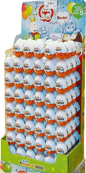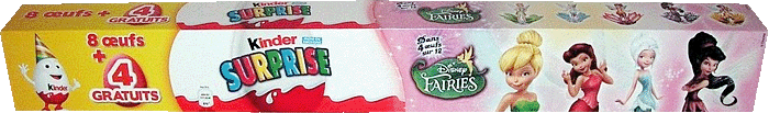 Diese 3er Packs der aktuellen Ü-Ei Serien sind in Italien zu bekommen. Das Foto rechts zeigt einen Bodenaufsteller der Geburtstagsparty. Das Foto wurde in Slowenien geschossen, dort kostet ein Ü-Ei 80 Cent. Aus Frankreich kommt diese 12er Stange Disney Fairies. Enthalten sind vier 3er Packs. Gesamtlänge stolze 60cm. Laut Aufschrift sollen 4 Figuren enthalten sein. Quelle: [Diese eBay Auktion]