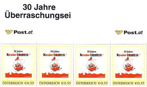 Dietmar S. aus Österreich ist es gelungen, nach langem Hin und Her eine Genehmigung für diese Ü-Ei Briefmarke zu bekommen. Entworfen wurde die Marke ebenfalls von Dietmar S. Die Marke wirbt für 30 Jahre Kinder Überraschung. Die 55 Cent Briefmarke ist auf 200 Stück limitiert. Auf dem Bild es ein Teil eines Briefmarkenbogens zu sehen. Zu bekommen ist die Marke in dieser Auktion von Dietmar Schatz. [eBay Auktion] Da es keine limitierte Nummerierung gibt, kann die Auflage von 200 Stück nicht kontrolliert werden. Unter www. meinemarke. at kann man sich ähnliche Marken erstellen lassen. Bei den Fotos oder Bildern für die Marke sollte auf jeden Fall darauf geachtet werden, dass keine Markenrechtsverletzung begangen werden.