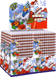 Die Zeit der Pisten Gaudi rückt näher. Am Montag den 27. 12. ist schon der offizielle Auslieferungsstart der neuen Ü-Eier Serie. Auf dem Bild sind vier 864er Aufsteller zu sehen, die ein Gebinde ergeben. Die 4 Aufsteller sind mit Kantenschoner versehen. Oben über dem Aufsteller ist eine Papptafel. In der Papptafel sind die sechs Figuren der Serie zu sehen. Sie befinden sich in zwei Kunststoffröhren. Dieser Satz kann in der jeweiligen Filiale gewonnen werden. Dafür muss man nur an der Verlosung teilnehmen. Teilnahmekarten sind unten in der Mitte des Pappaufstellers, wo auch gleichzeitig die Los Box ist. Live suche nach den ersten Auktionen vom [Pisten Gaudi mit den Looney Tunes]