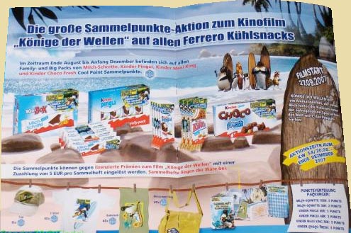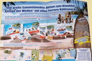 Ende August bis Dezember startet die nächste Sammelpunkte-Aktion. Auf dem Ü-Ei waren die Sporttaler und Milchtaler. Diesmal sind nur auf den abgebildeten Produkten Sammelpunkte. In der Sammelaktion dreht sich alles um den kommenden Kinofilm "König der Wellen", was wohl der Grund ist, dass nur die Kühlsnacks mit Sammelpunkten versehen sind. Die Prämien hängen unten auf dem Bild an der Leine. Die Adidas Sport-Taler Sammelaktion scheint ein voller Erfolg gewesen zu sein, da immer noch nicht jeder die Prämien erhalten hat.