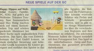 Auf der Games Convention in Leipzig wurde dieses neue Spiel vorgestellt. Das Spiel heißt "Happy Hippos auf Weltreise" und es ist ein Jump and Run Spiel. Das Spiel soll für Nintendo DS und PC erscheinen. Vielleicht gibt es die Hippos Figuren irgendwann als Serie :-) Alle weitere Informationen einhält dieser Zeitungsbericht. Danke für die News an Nico S.
