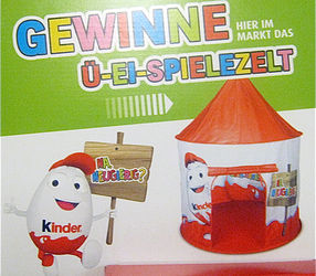 Beim aktuellen Überraschungsei Gewinnspiel gibt es ein Ü-Ei-Spielezelt zu gewinnen. Um an dem Gewinnspiel teilzunehmen, muss in dem Supermarkt, wo das Gewinnspiel angeboten wird, eine Teilnahmekarte ausgefüllt werden und ab in die dort vorhandene Losbox damit. Mit etwas Glück kann das Zelt auf dem Bild gewonnen werden. Das Zelt hat eine Höhe von 1,5 Meter und einen Durchmesser von 1,2 Meter. Quelle: [und mehr Bildmaterial in dieser Auktion]