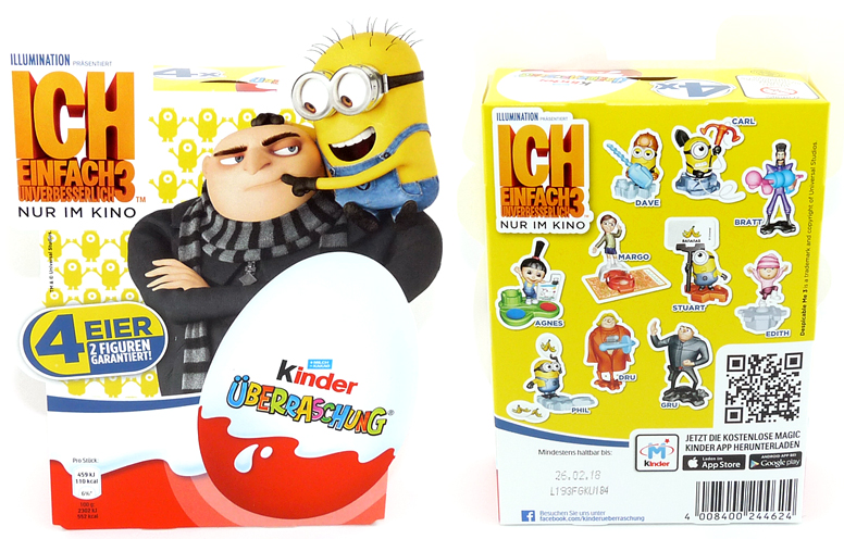 Von den Minions gibt es ebenfalls ein 4er Pack. Das Cover zeigt Minion Phil, der bei Gru auf der Schulter sitzt. Auf der Rückseite der Packung sind alle 10 Figuren der Serie abgebildet und mit Namen versehen.