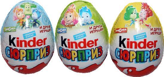 In Russland gibt es seit diesem Monat eine neue Überraschungseier Serie. Name der neuen Serie ist Fixiki. Dabei handelt es sich um Figuren aus einer russischen Zeichentrick Fernsehserie. Die Ü-Eier haben eine serienbezogene Umverpackung. Quelle:Diese eBay Auktion
