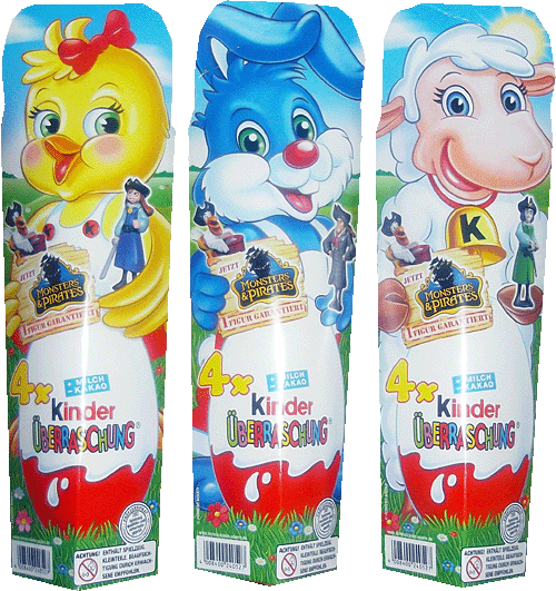 In den Oster 4er-Packs ist wie immer eine Figur garantiert enthalten. Dieses Jahr gibt es die Monster und Piraten 2. Auf den Ü-Eiern der Oster-4er-Packs und den Motiveiern sind keine Sammelpunkte der WM Fan Connection 2014 mehr enthalten. Das 4er Pack kostet derzeit 2,49 Euro im Kaufland. Es gibt 3 verschiedene Motive der 4er Packs. Sowohl auf der Vorder-, als auch auf der Rückseite der Oster-4er-Packs sind die Figuren zu Monster und Piraten 2 abgebildet. Die Motiveier kosten derzeit 69 Cent. Auch in den Oster Motiveiern sind die Monster und Piraten 2 versteckt. Derzeit sind 8 verschiedene Motive der Osterserie vom Staniolpapier bekannt. Wie schon in der 1. Piraten Serie gibt es wieder Schatzkarten, die man in den Figuren selbst verstecken kann. Zu der Schatztruhe, dem Kompass und dem Pelikan gibt es keine Schatzkarten. Um die Schatzkarten gibt es diesmal keine kleinen Gummiringe, wie es bei der ersten Piratenserie der Fall war. Ob in den beiden Schiffen Schatzkarten dabei sind, ist noch nicht bekannt. In den restlichen Figuren sind welche dabei. Vorsicht beim Einstecken der Schatzkarten in die Figuren, in den Figurenunterteilen sind seitlich Zapfen, die die Schatzkarten beschädigen könnten. Die Monster und Piraten 2 Ü-Eier gibt es bis Ende April 2014. Danach kommt wie immer das Kinder Joy Ei. Die ist die Voderseite des neutralen Beipackzettels von den Piraten 2. Auch dieses Jahr zu Ostern gibt es Larry den Hasen von Ferrero Kinderüberaschung. Im Bauch von Larry ist eine Ü Ei Kapsel versteckt. Der Preis von Larry beträgt derzeit 1,99 Euro. Ob auch in diesen Kapseln die Piraten 2 versteckt sind, ist bisher nicht bekannt.