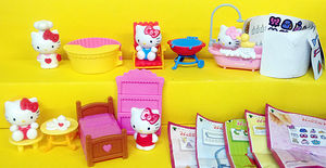 In den Oster Maxi Eiern stecken unter anderem diese fünf Hello Kitty Figuren. Die fünf Inhalte ergeben den Hello Kitty Satz. Zu jeder Kitty Figur gehört eine Menge an Zubehör. Quelle und [zu bekommen in diesen eBay Auktionen]