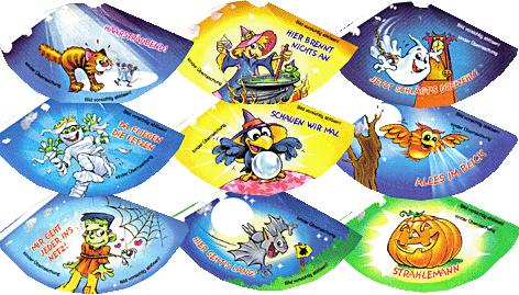 Dieses Jahr gibt es 10 unterschiedliche Halloweenhütchen. Die Motive der Hütchen zeigen gruselige Gestalten. Die Sprüche der Hütchen sind recht zweideutig gehalten, wie bei dem Hütchen links. Dies sind die anderen 9 Hütchen. Es gibt dieses Jahr 30 verschiedene Produktionsnummern auf den Hütcheninnenseiten! Die Nummern sind von Nr. 31-60 fortlaufend, wobei die Nummern 31-40 selten sind. Alle Nummern sind dieses Jahr in roter Schrift und befinden sich unter dem Kleberand, so dass man sie von außen nicht sehen kann (siehe Hütchen links). [Link zu den Auktionen]