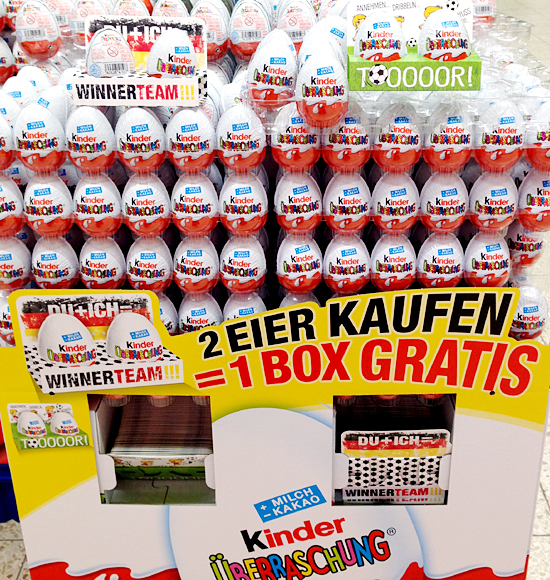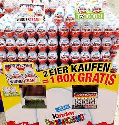 2 Eier kaufen 1 Box gratis. Damit wirbt dieser Überraschungseier Aufsteller. Es gibt vier unterschiedliche Faltboxen, einmal mit der Aufschrift WINNERTEAM!!!, Du bist Spitze, Volltreffer und TOOOOR!. Gedacht sind die Boxen als Mitbringsel zum Fußballabend in Bezug auf die Europa Meisterschaft 2016 in Frankreich.