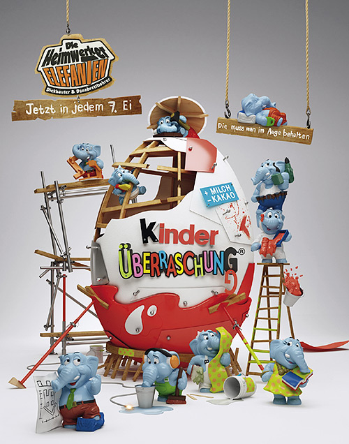 Dieses Werbebild der Heimwerker sollte man zuerst in Ruhe anschauen und einfach genießen. Die Liebe zum Detail wird hier deutlich. Das riesen Ü-Ei ist von den Heimwerkern fast fertig zusammengebaut. . . na sagen wir mal zusammengewerkelt ;-) Alle 10 Figuren der Serie sind optimal in Position gebracht. Bei der Werbung handelt es sich um das Startbild der neuen Webseite von [Kinderueberraschung]. Das Bild ist interaktiv, so dass jede Figur angeklickt werden kann. Nach dem Anklicken kommen alle Details und eine Großaufnahme der jeweiligen Ü-Ei Figur. Die Fernsehwerbung von der aktuellen Hauptserie war in der letzten Zeit ziemlich identisch, das ist jetzt vorbei. Es gibt drei neue TV Spots, die auf sich aufmerksam machen: [Zu den TV Spots]. [Die Heimwerker im Shop]!