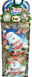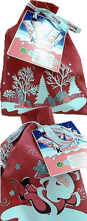 Bei diesem "Kinder Decor" soll es sich um deutsche Testware handeln. Es sind zwei Kinder Schokoeier zum Aufhängen. Die Schokeierhälften sind aus Ü-Ei Schokolade, die auf Décorpappe sind und aufhängt werden können. Es gibt zwei Motive, einmal das Ü-Ei als Weihnachtsmann und einmal als Rentier. Zu bekommen in dieser eBay Auktion Rechts auf dem Bild sind zwei Weihnachtssäckchen zu sehen. In den Weihnachtssäckchen befinden sich die Kindermix Leckerein von Ferrero. Bei den Weihnachtssäckchen handelt es sich ebenfalls um deutsche Testware. Auf dem kleinen Zettel sind die Inhalte zu sehen.