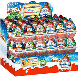 In den Eiern steckt eine neue Serie Namens "Witzige Weihnachtswirbler". Zwei Weihnachtswirbler sind unten links auf dem 72er Display zu sehen. Um das Bild vom Display zu vergrößern, einfach einmal draufklicken. Die Weihnachtswirbler Figuren haben ein Bändchen, womit sie aufgehängt werden können.